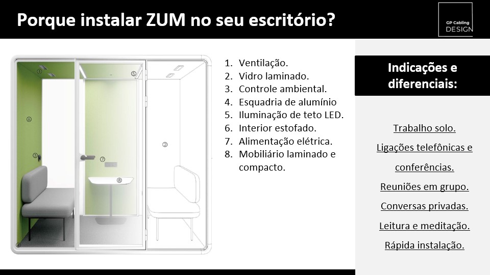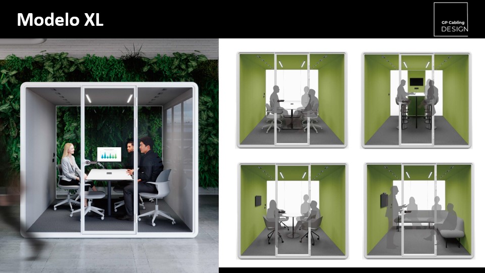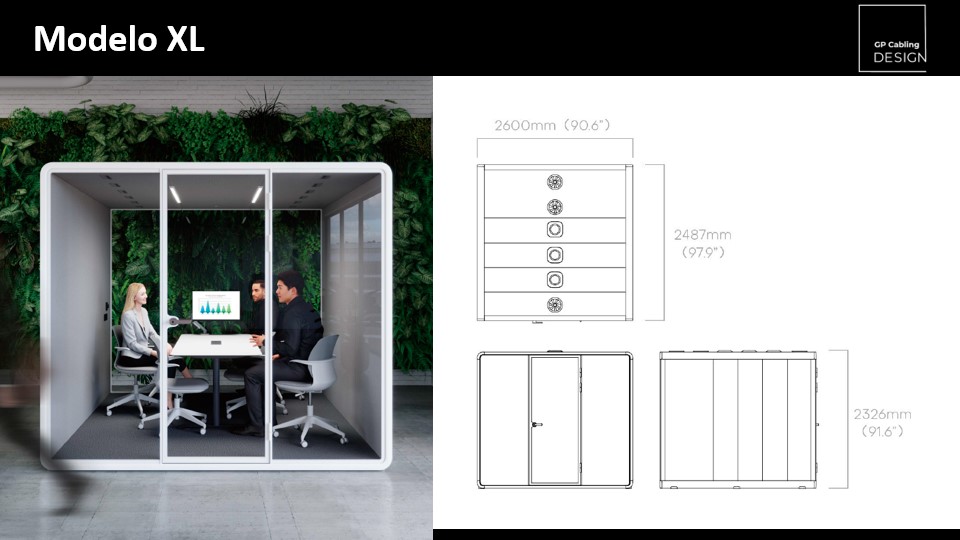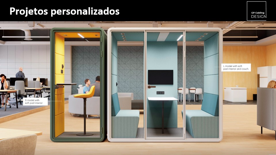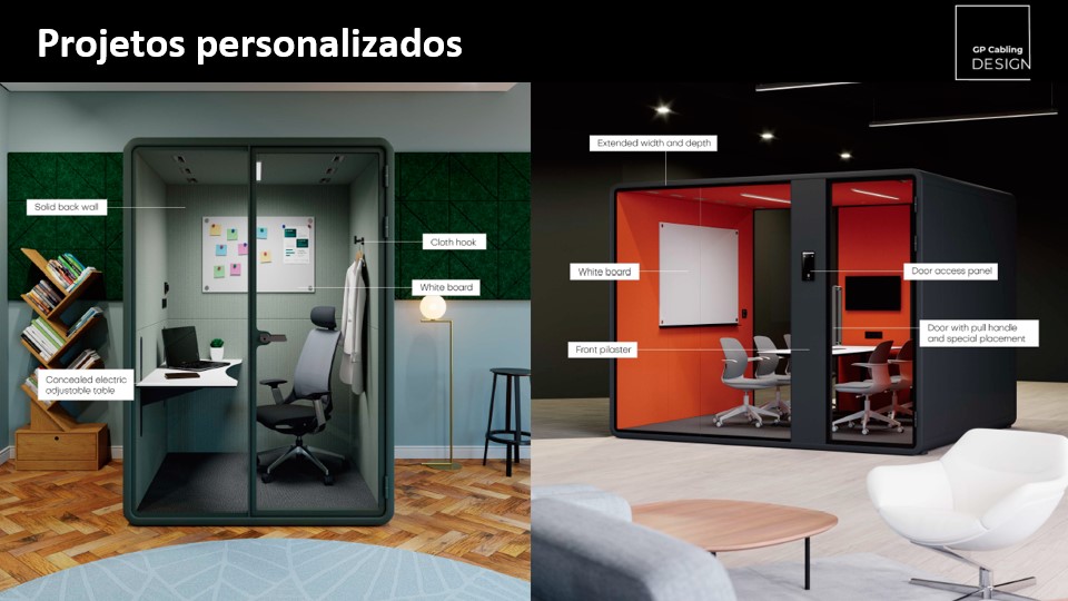 Com design modular, pode ser montada em poucas horas e personalizada para se adequar a qualquer ambiente. O isolamento acústico foi projetado para garantir conforto, foco e a segurança de saber que suas conversas não irão vazar para fora da cabine.