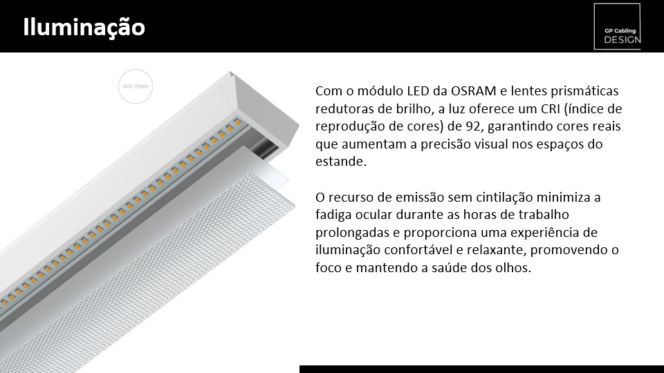 Com o módulo LED da OSRAM e lentes prismáticas redutoras de brilho, a luz oferece um CRI (índice de reprodução de cores) de 92, garantindo cores reais que aumentam a precisão visual nos espaços do estande.