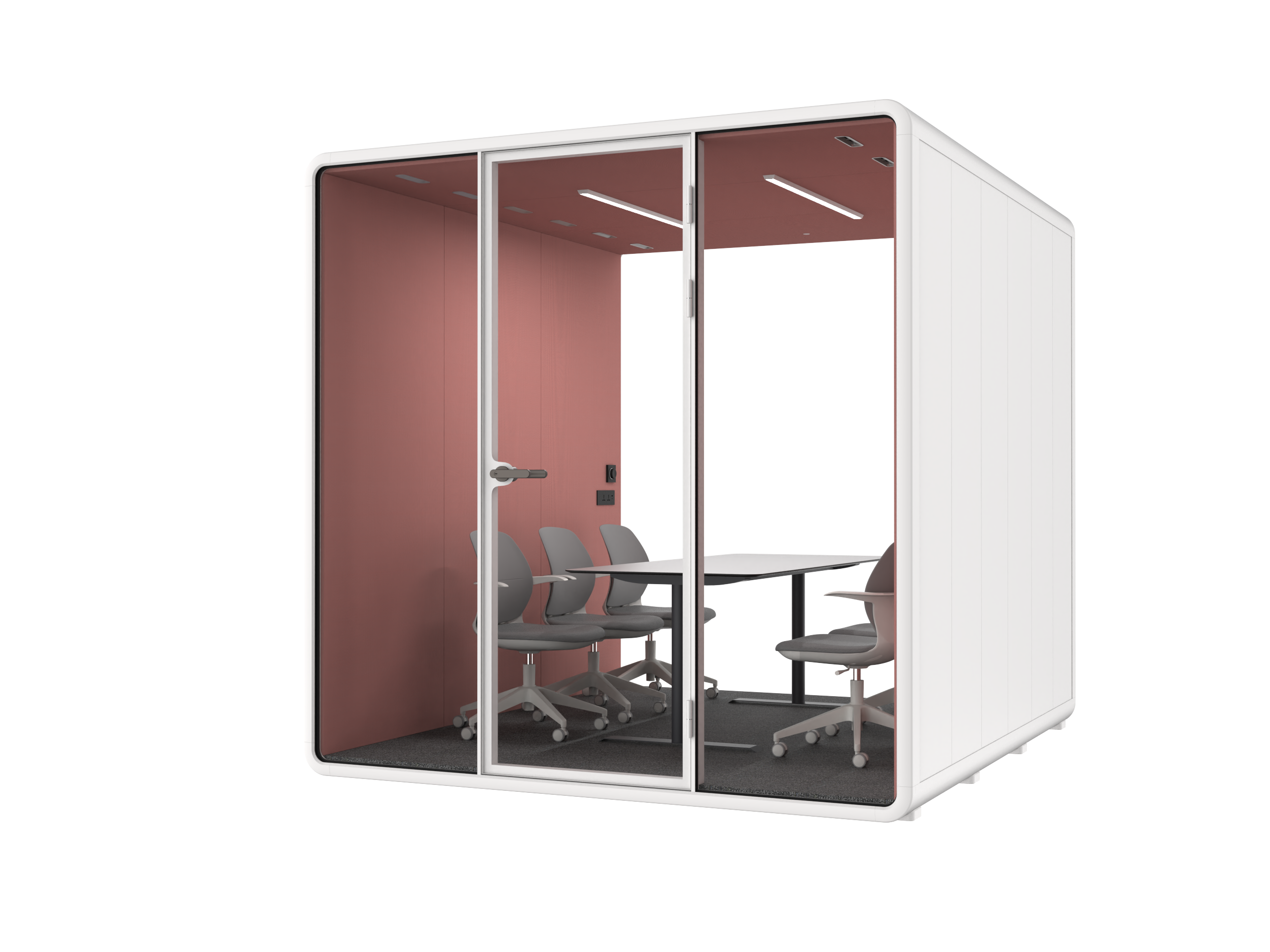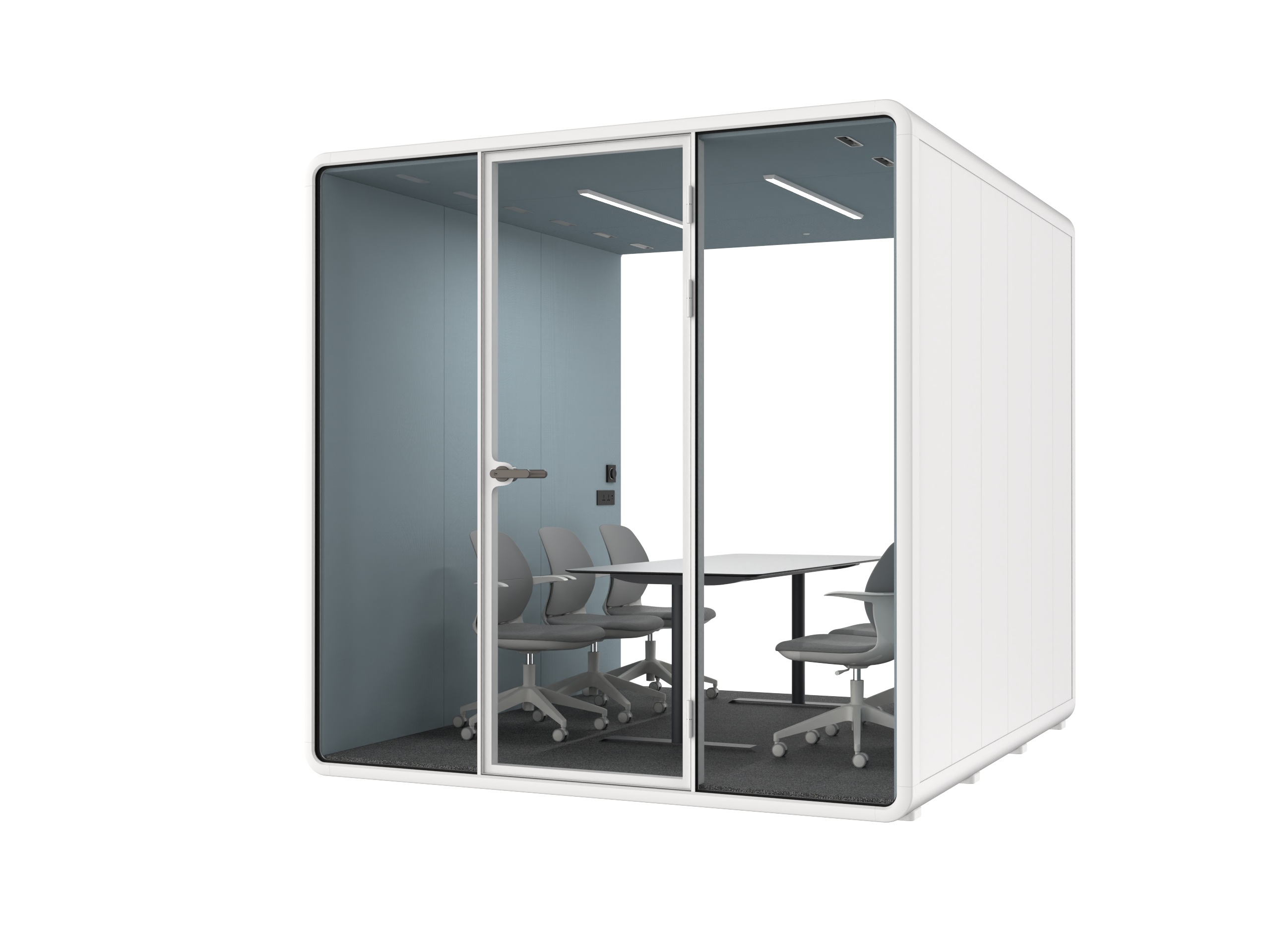 Projetada com as necessidades do seu escritório em mente, nossa cabine acústica funciona como ambiente de trabalho e pode servir como uma sala de reunião extra à sua disposição.